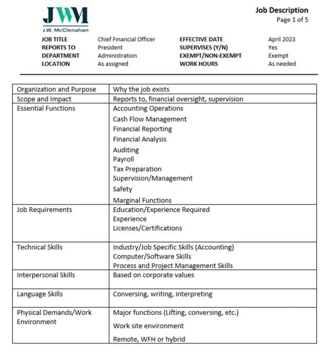 The three main sections to review are (1) ESSENTIAL FUNCTIONS, (2) EDUCATION AND EXPERIENCE REQUIRED, and (3) TECHNICAL SKILLS. Many of the other components are standard to the company, the position, or the employee classification.
